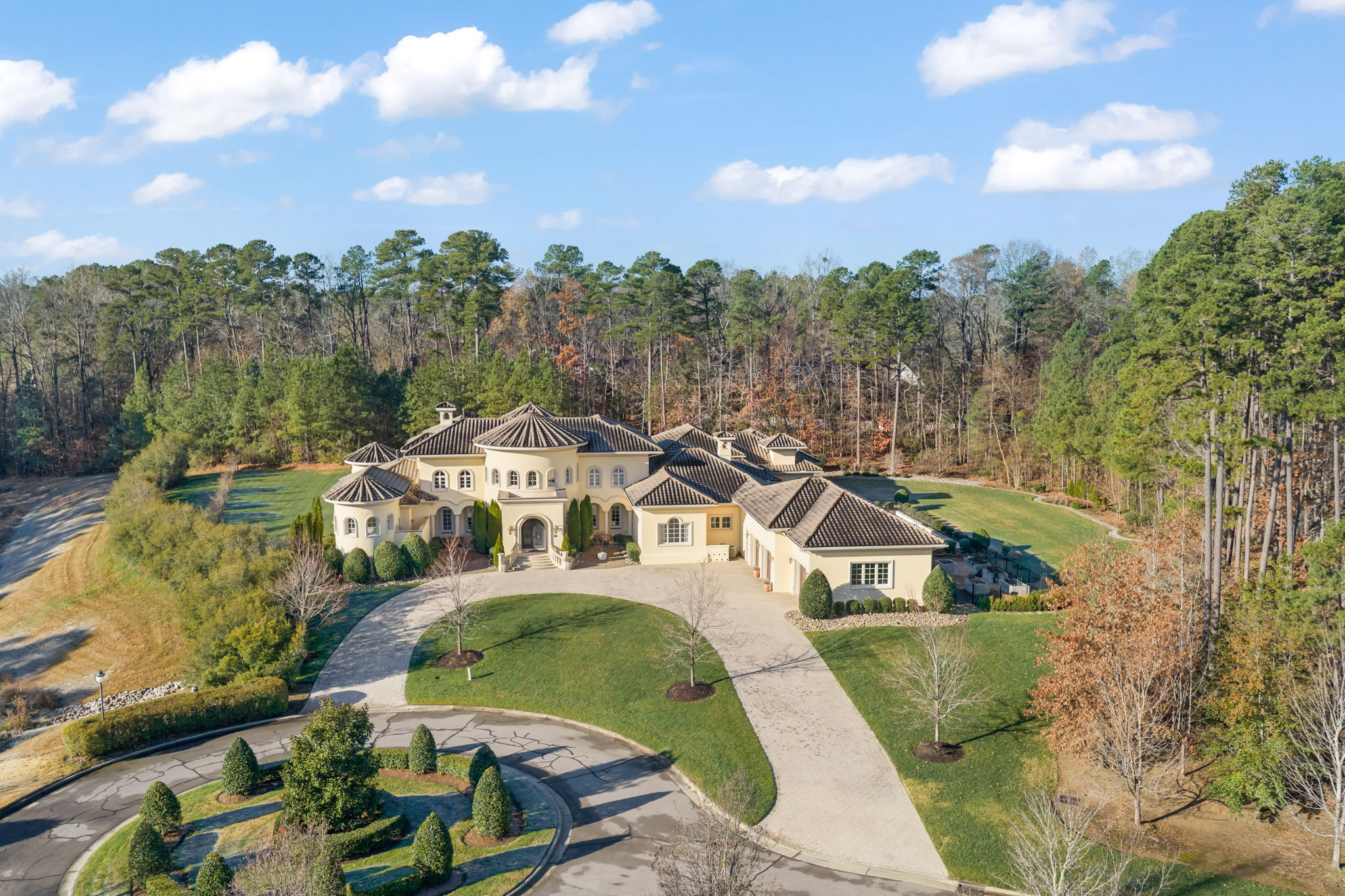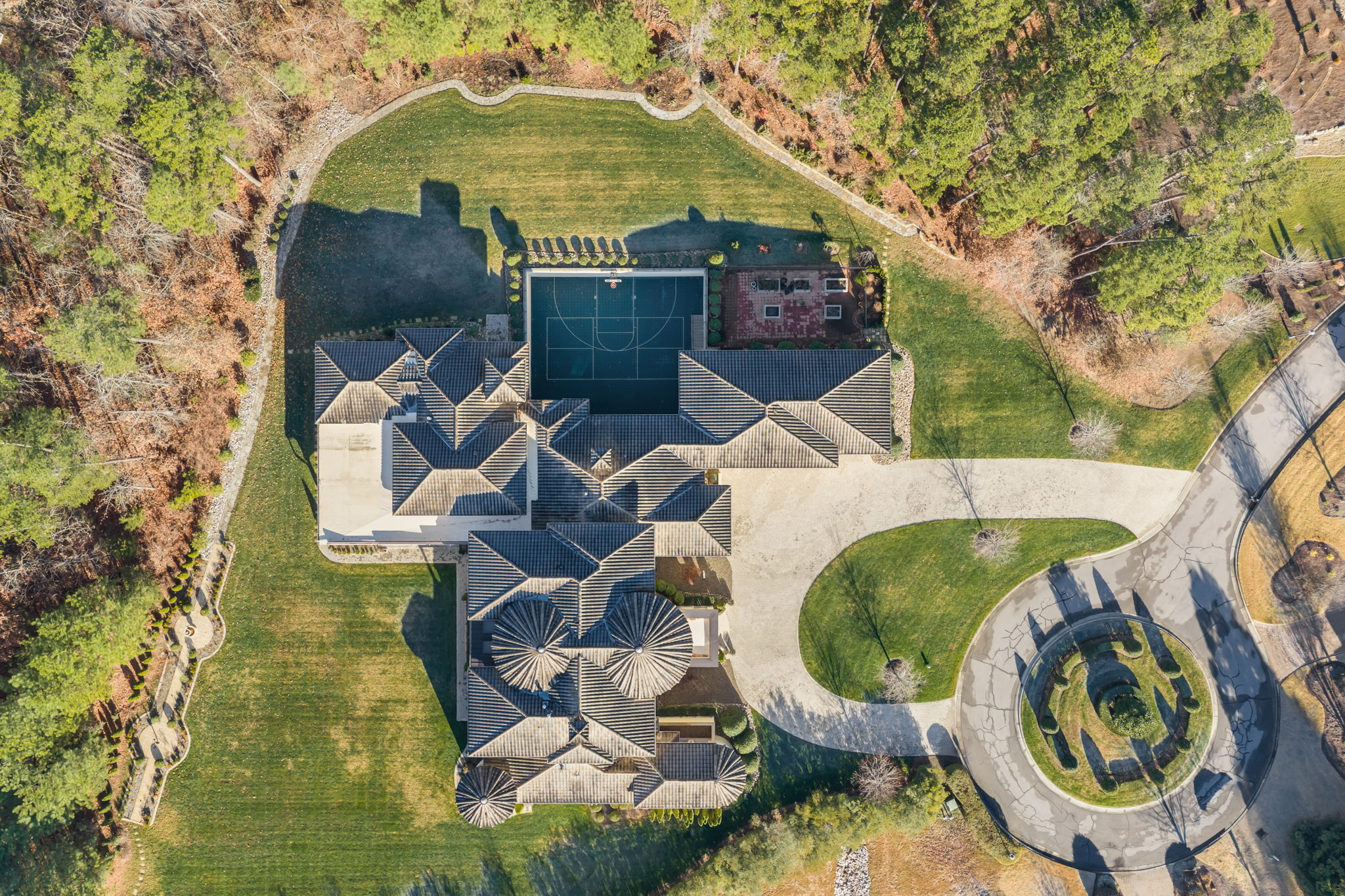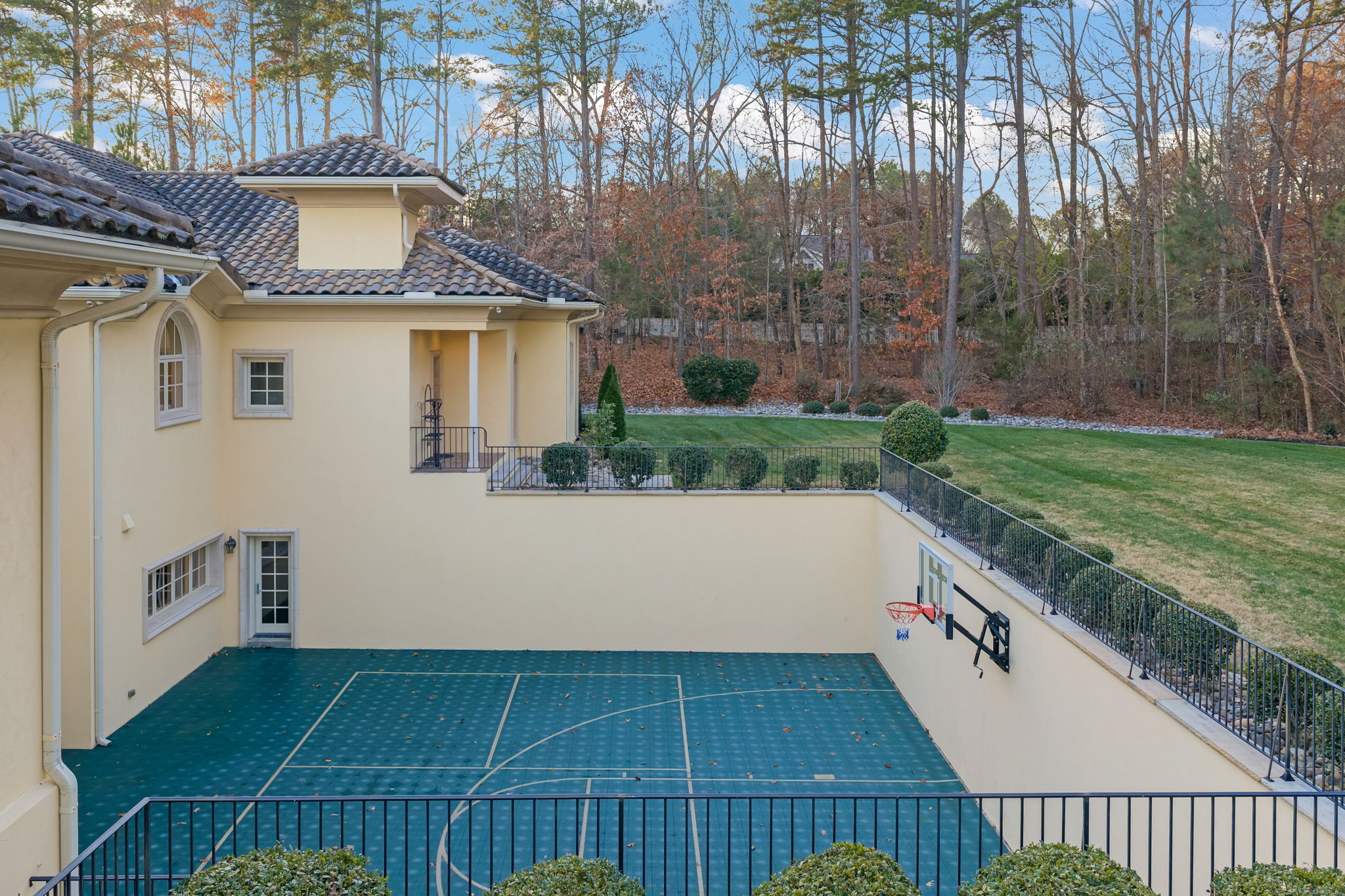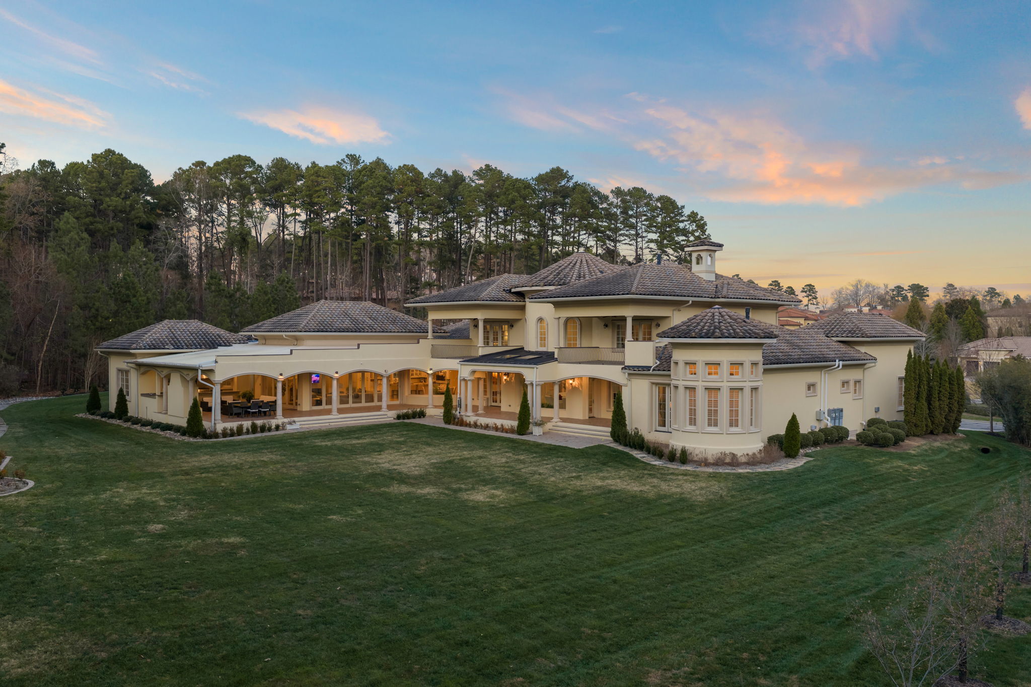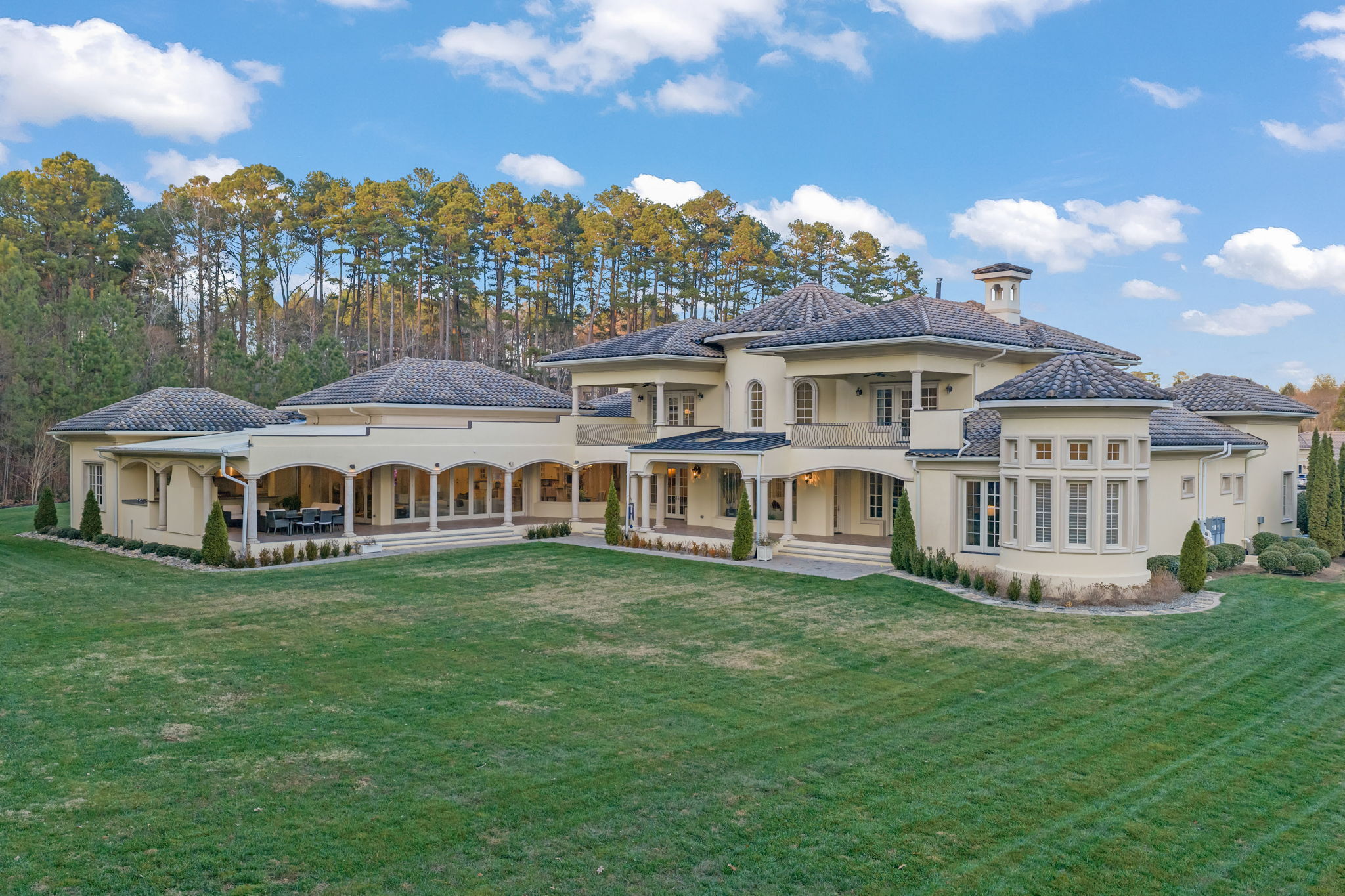 Discover refined elegance in this 13,341 sq. ft. Mediterranean-inspired estate on 3.31 private acres in Maida Vale, one of the Triangle’s premier gated communities. Offering rare privacy with unmatched convenience, this in-town estate sits minutes from RTP, RDU, Duke, UNC, world-class healthcare, and premier shopping. Built with ultra-durable concrete construction and a barrel-tile roof, it delivers lasting quality, energy efficiency, and peace of mind. Designed for both everyday luxury and large-scale entertaining, the home features an expansive covered veranda with an outdoor kitchen, fireplace, lounge area, and retractable window walls; a private sports court; a separate gym with steam shower; a movie theater and wine room; and a level rear yard envisioned for a custom pool (subject to approvals). Seamless indoor/outdoor flow creates an effortless setting for gatherings of any size. A fully self-contained lower level offers exceptional flexibility for extended family or multigenerational living, complete with its own kitchen, two bedrooms, large living area with fireplace, sports court access, and private elevator. The main level includes a secluded owner’s wing with study, formal and informal living spaces, a gourmet chef’s kitchen, floor-to-ceiling windows, guest suite, second office, and direct access to the veranda. Upstairs, three spacious guest suites—including a second primary—feature private balconies overlooking the grounds. Set at the end of a quiet cul-de-sac with a circular drive and covered portico, the home welcomes you with dramatic staircases and clear views to the lush backyard. With its rare acreage, solid construction, low-maintenance design, and resort-style amenities, this residence represents exceptional value among the Triangle’s luxury estates. Conceptual pool rendering is AI-generated.