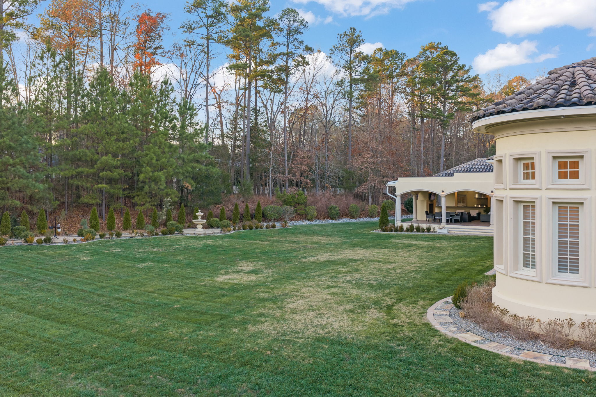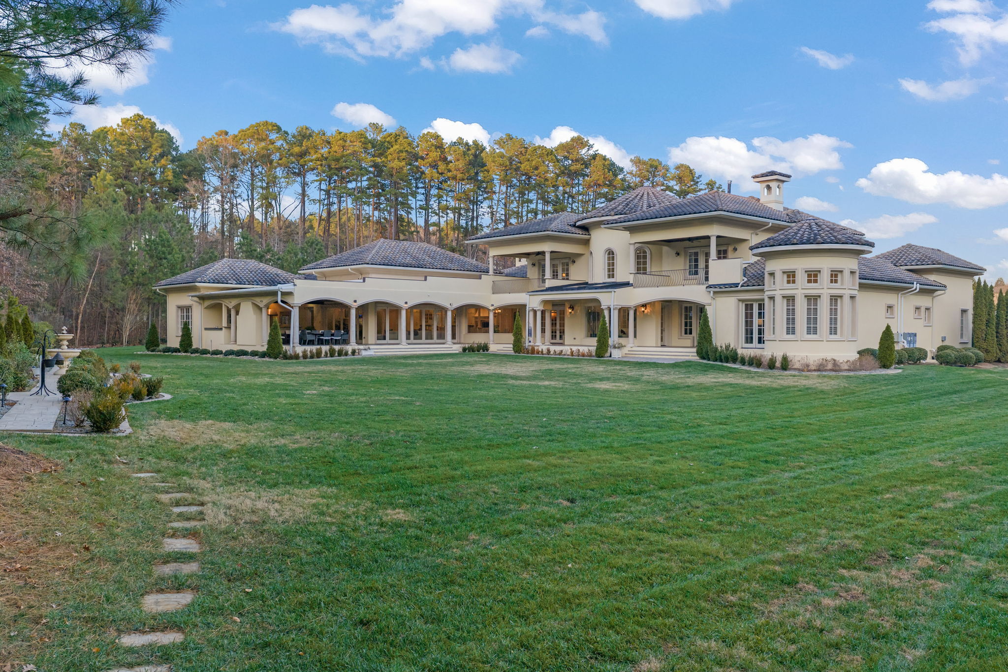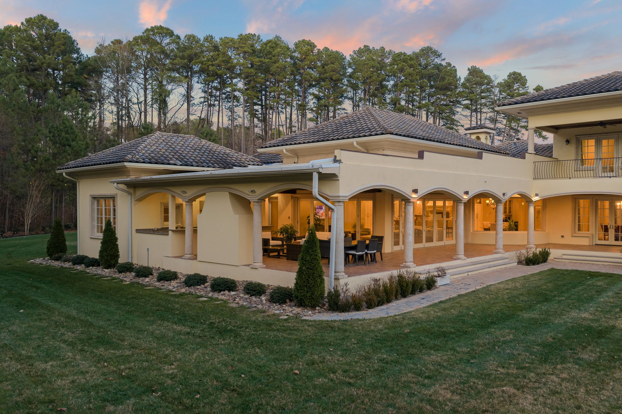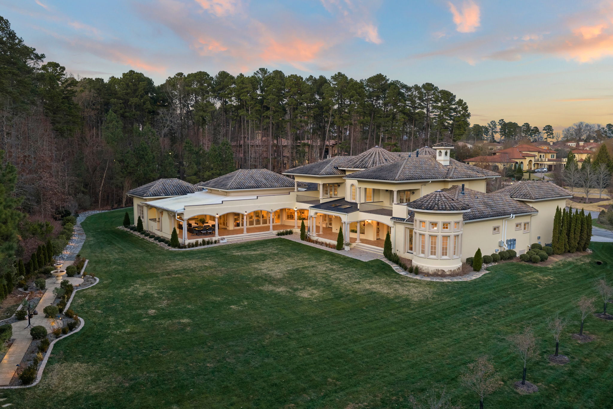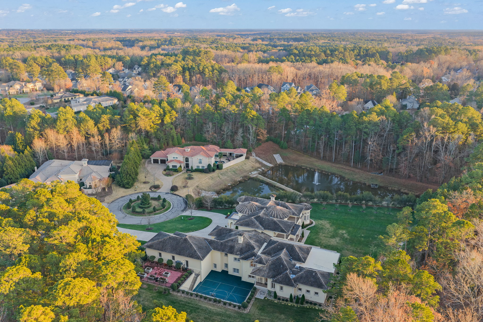 Discover refined elegance in this 13,341 sq. ft. Mediterranean-inspired estate on 3.31 private acres in Maida Vale, one of the Triangle’s premier gated communities. Offering rare privacy with unmatched convenience, this in-town estate sits minutes from RTP, RDU, Duke, UNC, world-class healthcare, and premier shopping. Built with ultra-durable concrete construction and a barrel-tile roof, it delivers lasting quality, energy efficiency, and peace of mind. Designed for both everyday luxury and large-scale entertaining, the home features an expansive covered veranda with an outdoor kitchen, fireplace, lounge area, and retractable window walls; a private sports court; a separate gym with steam shower; a movie theater and wine room; and a level rear yard envisioned for a custom pool (subject to approvals). Seamless indoor/outdoor flow creates an effortless setting for gatherings of any size. A fully self-contained lower level offers exceptional flexibility for extended family or multigenerational living, complete with its own kitchen, two bedrooms, large living area with fireplace, sports court access, and private elevator. The main level includes a secluded owner’s wing with study, formal and informal living spaces, a gourmet chef’s kitchen, floor-to-ceiling windows, guest suite, second office, and direct access to the veranda. Upstairs, three spacious guest suites—including a second primary—feature private balconies overlooking the grounds. Set at the end of a quiet cul-de-sac with a circular drive and covered portico, the home welcomes you with dramatic staircases and clear views to the lush backyard. With its rare acreage, solid construction, low-maintenance design, and resort-style amenities, this residence represents exceptional value among the Triangle’s luxury estates. Conceptual pool rendering is AI-generated.